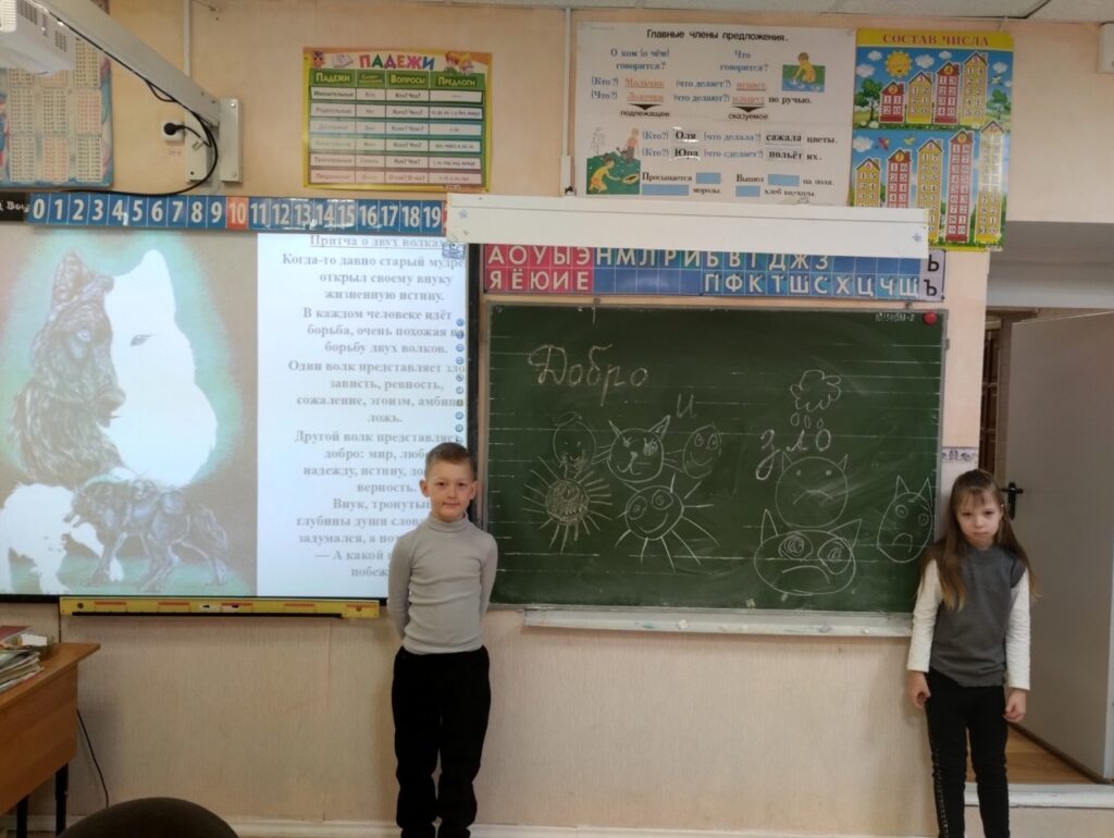 Ребята прослушали притчу о двух волках, вспомнили пословицы о добре и зле, обсудили различные жизненные ситуации, посмотрели мультфильм о добрых поступках. Итогом мероприятия стало совместное решение учащихся : всегда идти дорогую добра!